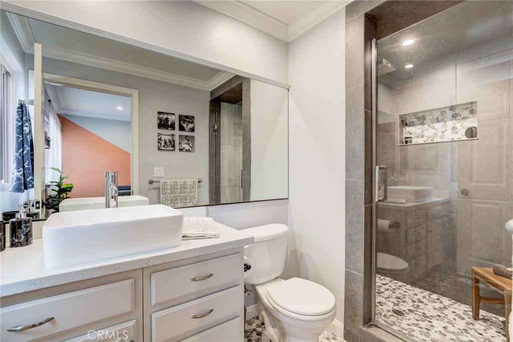 Welcome to 676 Shepard #3! This one is a stunner throughout with updated features at every opportunity. The main level is complete with an oversized living room with ocean views from the couch! The spacious patio is perfect for entertaining while enjoying people watching on the street below. The gorgeous kitchen comes complete with a generous amount of cabinet and counter-top space for all your cooking needs as well as an attached back patio. Recessed lighting throughout, quartz countertops, a large marble island and stainless steel appliances complete the gourmet kitchen. Both master bedrooms are upstairs and fully remodeled. The first master comes complete with a full spacious bath; dual vanity and fully upgraded. This one has a spacious balcony with ocean and Catalina views. Also upstairs, the second master suite with custom paint and an upgraded bathroom with stand up shower. Completing Unit 3 is a two car attached garage with epoxied flooring, built in storage and the 3rd bedroom/office/bonus room off the garage. Just steps from the Point Fermin Cliffs; you can run on trails along the ocean, enjoy the park for family picnics, walk to the local coffee shop and you’re less than a mile from Cabrillo Beach. This one is a must see!