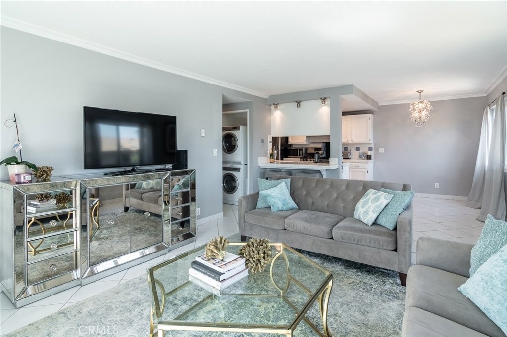 Bring your bed and move right in! This 2 bedroom, 1 bathroom end unit has great natural light with many windows, open floor plan and has all the updates needed. Kitchen is equipped with clean white tiles/cabinets, recessed lighting, stainless steel appliances (included) and bar countertop. Dining/Living rooms have large double pane windows and sliding door, newer stackable washer/dryer units inside unit and plenty of storage space. Balcony is perfect for relaxing and peek-a-boo views of the Port of LA. Both bedrooms have newer carpet and large sliding mirrored doors with plenty of closet space. This well maintained building (only 13 units) is secured, community surveillance system, shared coined washer/dryer and also underground parking with 2 spots included with unit. Just blocks away from restaurants, stores and upcoming waterfront promenade. Why rent when you can own? Come see this one for yourself!