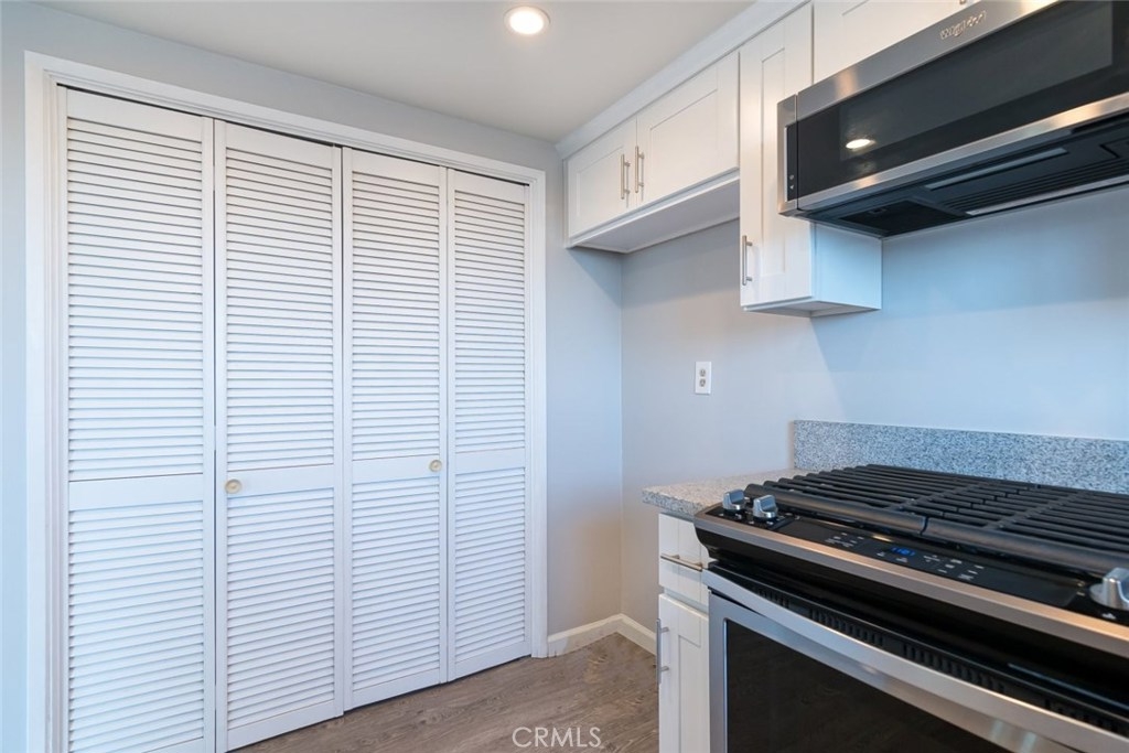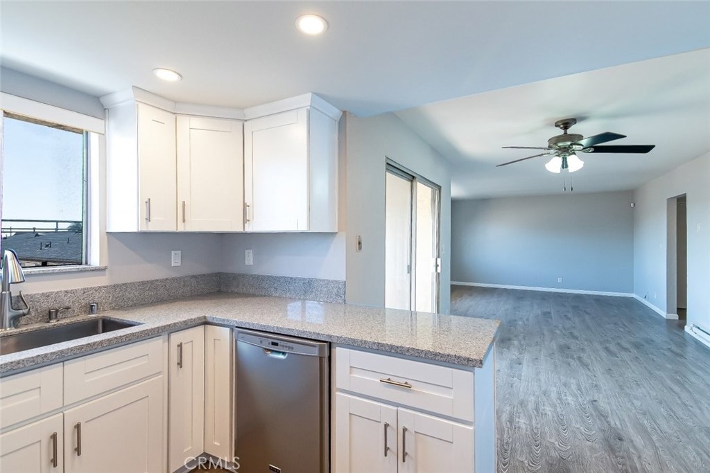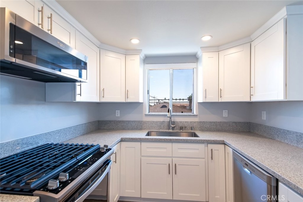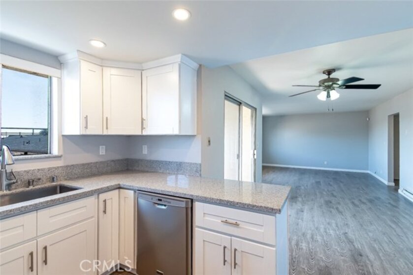 Gorgeous 2 bedroom, 2 bathroom condo located in the Casa La Villa in the desirable Vista Del Oro area of San Pedro! Leading up to the home, this unit is tucked away towards the back of the intimate 10 unit building providing extra privacy. As we enter the home, we are greeted by a spacious open layout with natural light shining through the patio sliding door, and while we're there, step outside the patio and enjoy a peek-a-boo view of the Harbor! The kitchen is remodeled with stainless steel appliances, new white shaker cabinetry, granite countertops, and a farmhouse sink. Heading down the hall, this home features a full size laundry room next to the primary bedroom and en-suite bathroom with new luxury vanities. The additional bedroom is sun-filled and next to the guest bathroom. Just minutes away from the 110 freeway, the San Pedro waterfront, and Point Fermin Park, this home is the perfect combination of charm, convenience, and quality in the part of town you want to be in!