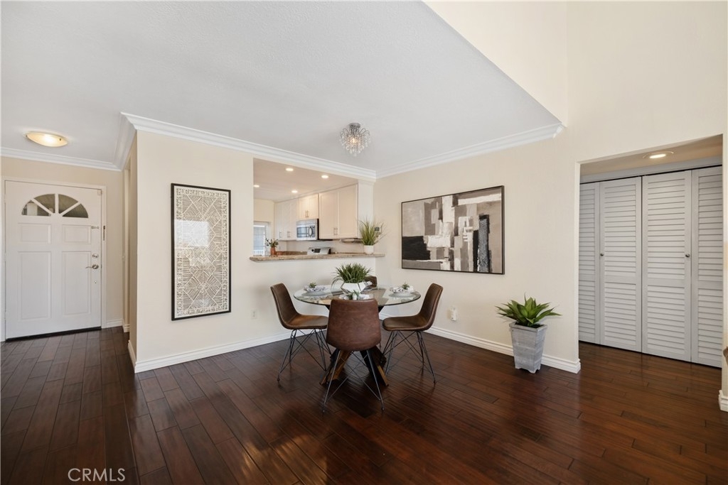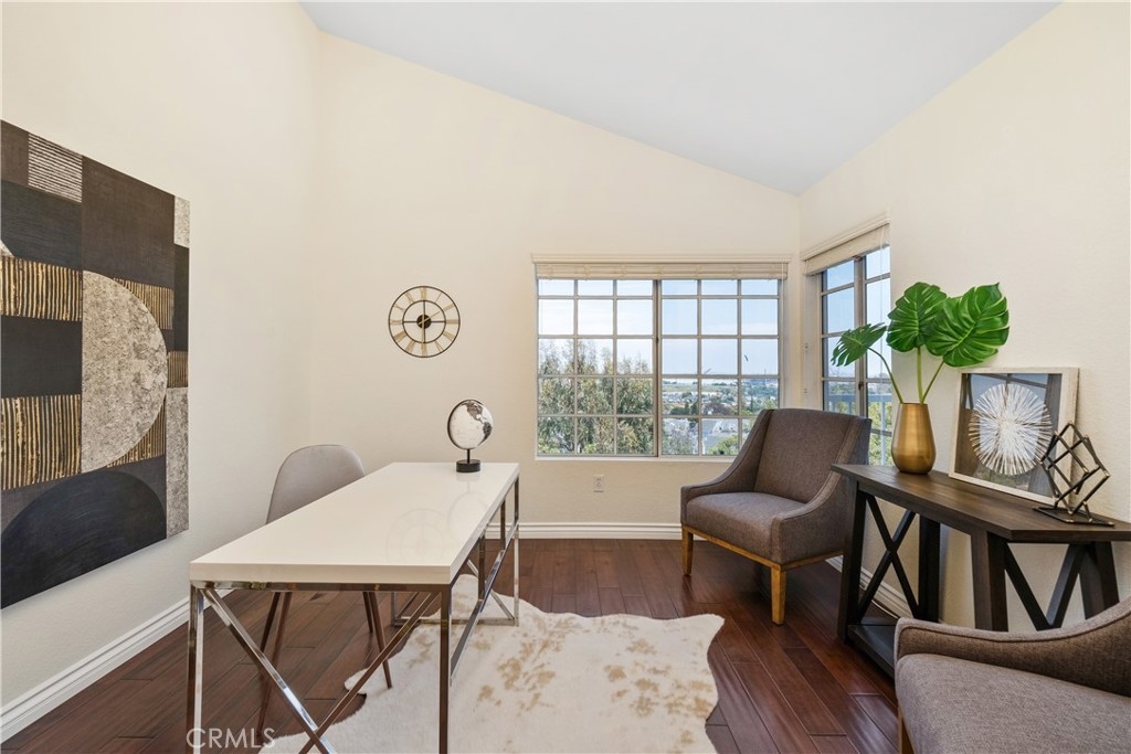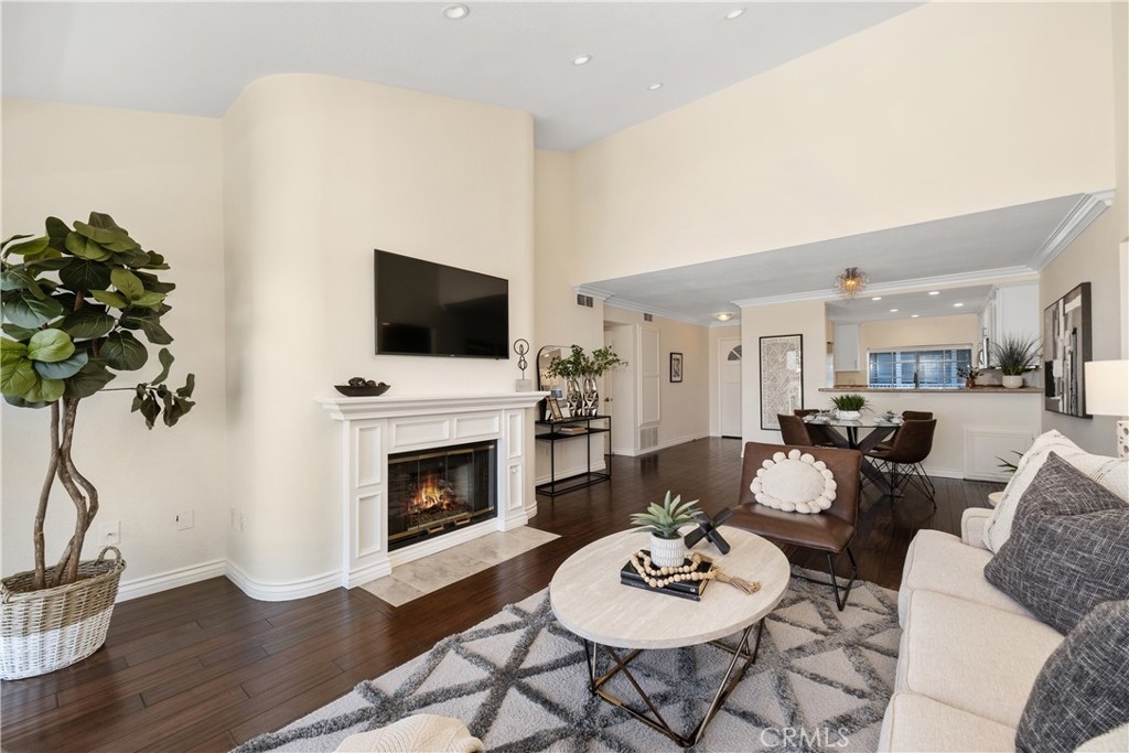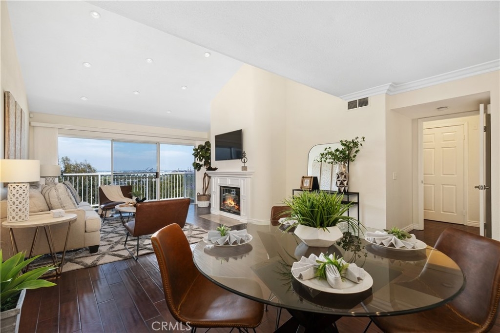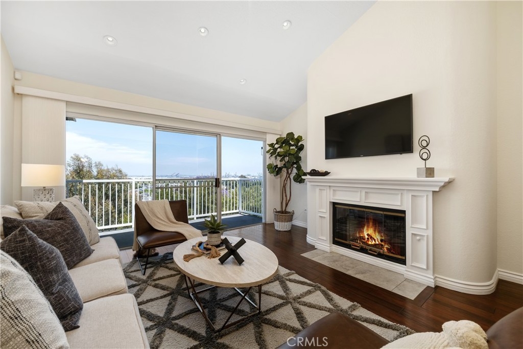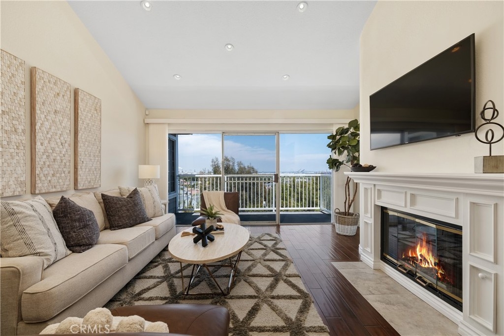 Location, Location, Location! This third-level end unit is highly sought after for its panoramic views of the harbor and city lights. From the moment you enter, the spacious open floor plan and dark wood flooring are illuminated by an abundance of natural light. The vaulted ceilings and recessed lighting add to the airy ambiance. As you move into the main area, you’ll pass the kitchen, which features stainless steel appliances, white cabinets, and granite counters. This space seamlessly opens to the dining room and the large living room, where a magnificent fireplace becomes the focal point. Sliding doors lead to the balcony, where you can enjoy beautiful breezes and endless views. Crown molding and wood flooring extend through the hallways, past the in-unit laundry, and into two of the three large bedrooms, located on one side of the unit. Both bedrooms have vaulted ceilings, ceiling fans, large windows, one with harbor views, plantation shutters and share a hallway with one of the two bathrooms that features double vanities and a walk-in shower. The primary bathroom suite also offers double vanities and a walk-in shower, along with a separate bathtub. The primary bedroom also enjoys harbor views and is situated off a separate hallway on the other side of the main living area for added privacy. Outside, manicured gardens and tree-lined walkways meander through this pet friendly community, complete with gentle running streams and waterfalls. You’ll find a large gated pool with a separate spa and lounging area nestled among lush landscaping and shade trees. The centrally located elevator towers near each building provide direct access to the gated parking below, where you’ll have two assigned parking spaces and a gate remote. Each unit also includes a private storage closet located along the exterior walkway between the elevator and your front door. Award-winning schools, nearby shopping centers, Peck Park, the LA Waterfront, and specialty restaurants make this location truly exceptional.