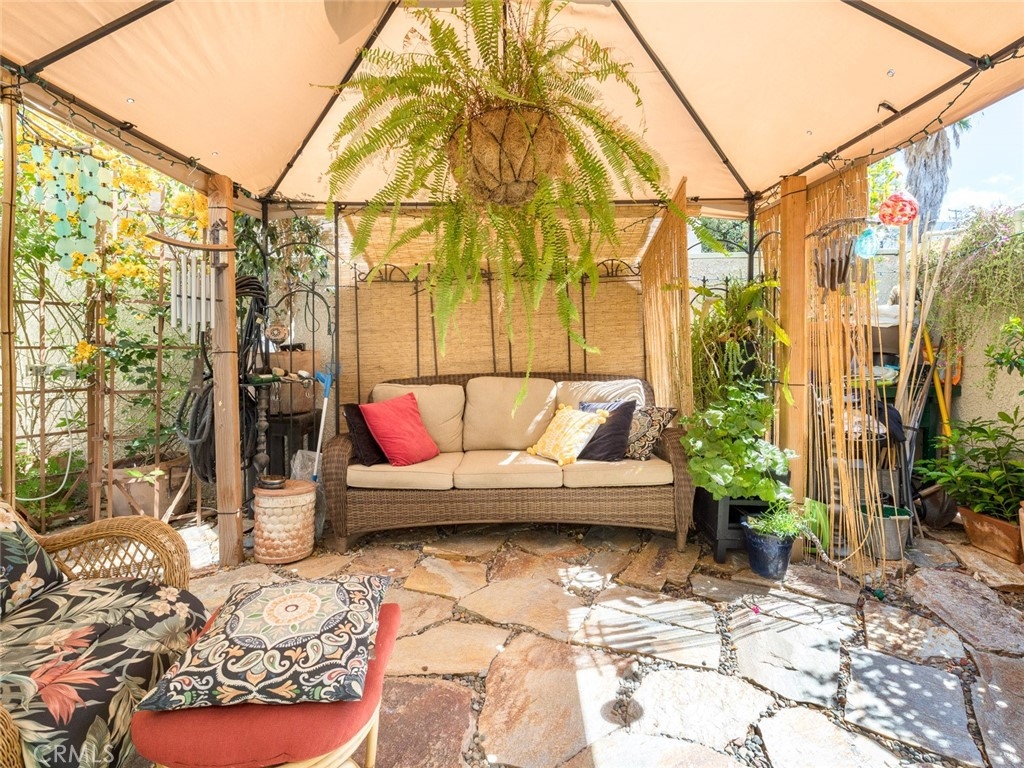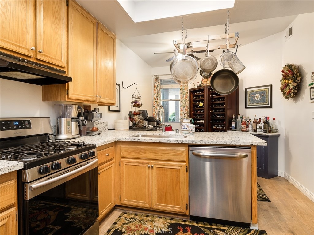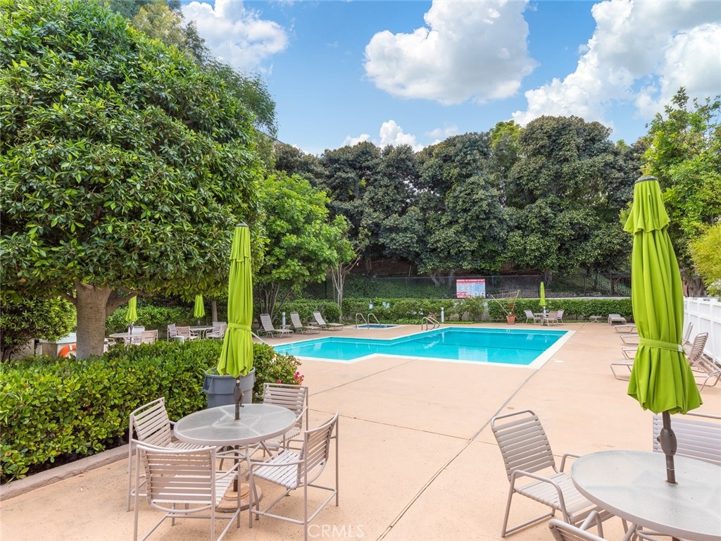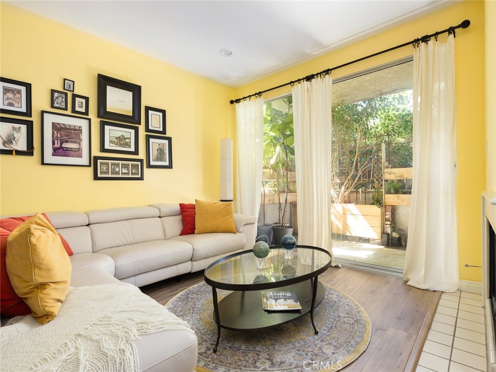 Rarely on the market this first floor unit has it all. The single level home has 1491 sq.ft. of living space and enjoys a ground level patio/yard. This remodeled up- scale unit boasts a great open floor plan with two spacious bedrooms, a huge liv- ing room, separate dining room and fireplace. Hardwood rustic floors are found throughout and create a warm feel as you enjoy all the upgrades. The attractive granite kitchen enjoys a new stainless steel appliance package including stove, and double door frig with ice and water on the door. The adjoining breakfast room is sunny and spacious. The huge master bedroom with double door entry enjoys a spacious master bath with two sinks, separate shower and tub, double closets and private access to the rear yard. Not many units have the special feature of a rear yard. The yard is lushly landscaped, has stone flooring and covered patio. It’s a special place to relax after a long day. Additional features include, air conditioning, designer colors, ceiling fan, tiled entry, recessed lighting. This small 38-unit complex offers pool, spa, recreation room and exercise room. The home includes 2 parking spaces in a secured subterranean garage at the end of a quiet, tree lined cul-de-sac. Outstanding arterial access and conveniently located to exemplary shopping, theaters and numerous outstanding restaurants!