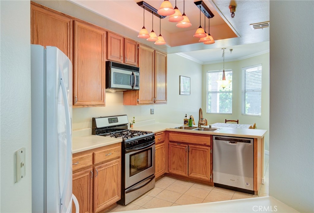 Welcome to the Terraces! Situated at the top of a cul-de-sac, the complex offers privacy and security, beautiful lush greenery, a quiet courtyard with pool, spa and bbq area, and a club room with a gym. This is a single level, end unit with LAUNDRY IN UNIT! This unit has 2 bedrooms and 2 full bathrooms. High ceilings make the home feel open and airy. Natural light flows through all bedrooms. Open concept kitchen opens to the grand-size living room. Kitchen comes with a BRAND NEW dishwasher! Kitchen also includes gas oven, breakfast bar, and separate dining area. Great natural light comes through the NEW dual-pane sliding doors into living room that lead to a spacious private patio. The home has AIR CONDITIONING for those days that become a little too hot and has heat for the chiller winter nights. Master bedroom is very spacious with a WALK IN CLOSET and a SECOND closet; also includes an EN-SUITE private bath with soaking tub, separate walk-in glass shower, long dual vanity area with his and her sinks and separate commode room for privacy! Second bedroom makes a great guest room or office space. Designated parking includes two assigned spots in a secured underground parking area. Schools are award winning Park Western Gifted Magnet Elementary and Rudecinda Sepulveda Dodson Middle School. What else could you want? Come and see your future home!