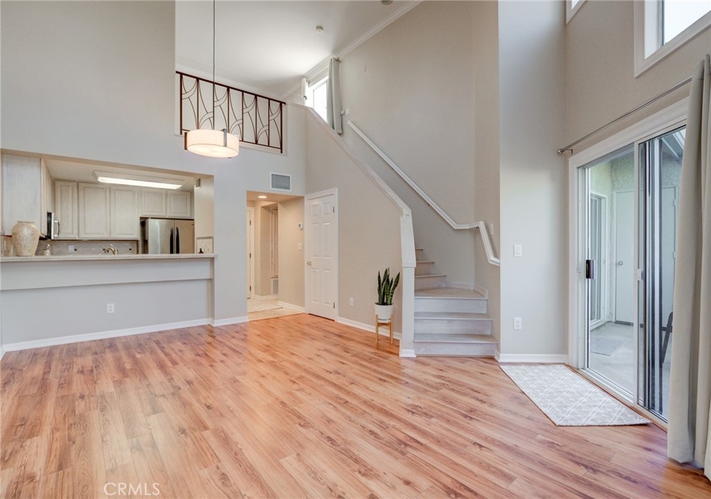 Welcome to resort living at desirable “Harbour Walk” Penthouse Condominium, Turn-Key, Move-In ready, Open Floor Plan. Living Room features high Dramatic Cathedral Ceilings, cozy gas Fireplace framed with natural stone, Dining area w/new contemporary drop light fixture, Crown Molding, incredible high windows provide natural light flow. Sliding door leads to private outside Balcony w/ East beautiful views! Galley Kitchen boasts natural stone counter tops and flooring, Counter Bar for quick dining, Plenty of Cabinets which are custom finished, Stainless appliances; Refrigerator, Dishwasher, 5 Burner Range w/griddle, Microware, newer Faucets and Disposal. Main Suite has Walk-in Closet, Sliding Door leading to Balcony, Main Bathroom w/Shower/Tub, Natural Stone Vanity. Laundry area features newer stackable full-size Washer/Dryer with easy access. Upstairs; Dramatic Staircase w/Custom finished steps and railing lead to Second Bedroom, closet has mirrored sliding doors, w/Private Bath, Natural Stone Vanity, Shower. Open concept Custom railing, which can be walled to suit owners’ needs. Secure, Gated parking garage w/Elevator access, 2 spaces,(491/532) close to elevator. Plenty of gated guest parking.. 2021, replaced HVAC system and installed LED Recessed Lighting. 2019, HOA completed $3 million refurbishment to all buildings; Repainted, exterior Lighting replacement, Roofing, Gutters, Doors, Railings! This Park like setting has a beautiful Pool, Spa, BBQ and Clubhouse for your relaxation. Walk to nearby shopping. Close to Freeway access. Don’t miss your opportunity for this one!