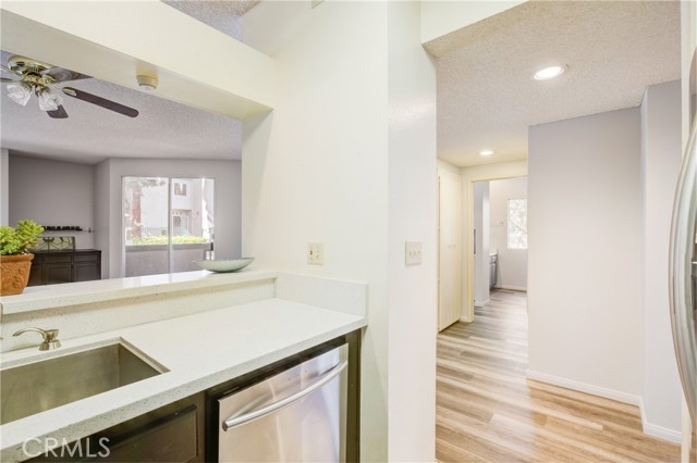 The complex feels like a blissful getaway with excellent views, and tall evergreen trees all around. Fresh paint and new laminate floors make for a cozy atmosphere. Enjoy the cook's kitchen with stone counters, dark wood cabinets, and stainless Samsung appliances including a huge french-door fridge, 5 burner gas stove, convection microwave, and low-profile high-efficiency dishwasher. Relax in the generous-sized bedroom with patio slider. Convenience is key with a full-size front-loading Samsung smart washer and dryer, central AC/heating, plenty of storage and built-ins, and 2 designated parking spots. Community amenities include a pool, 2 jacuzzis, and a BBQ area. Experience San Pedro with restaurants, retail stores, movie theaters, fitness centers, and much more at your doorstep.