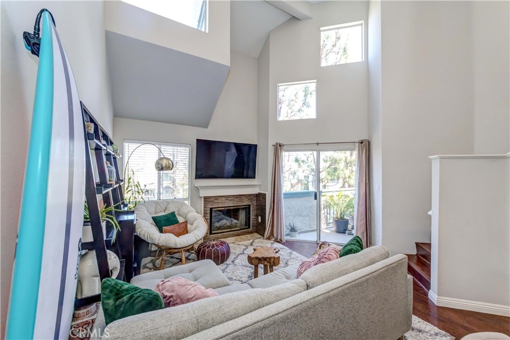 Welcome home to HARBOUR WALK community, a resort-style living in San Pedro. This top floor unit is located end of the 3rd floor with easy access by stairs. Inside, natural light through many windows and soaring high ceilings, a sense of openness greets you as you step inside. The kitchen features a new dishwasher, a stainless dual sink, and well-maintained cabinets. The living room has laminated hardwood floors, a cozy fireplace, and an adjacent patio. The master bedroom with bathroom inside is located on the main floor including a walk-in closet and balcony access. The second bedroom/loft is on the second floor with its own bathroom overlooking the downstairs. This unit comes with a stackable washer and dryer inside the unit, central A/C and heat, storage inside and out on patio, two parking spaces in the gated community garage. Amenities include a large pool, spa, BBQs, clubhouse, ample guest parking, and gated entry to the community. Roofing work and exterior painting completed by HOA in 2019. This community is conveniently located all within walking distance to shopping, restaurants, parks, and easy access to 110 FWY and Highway 47 to Long Beach.