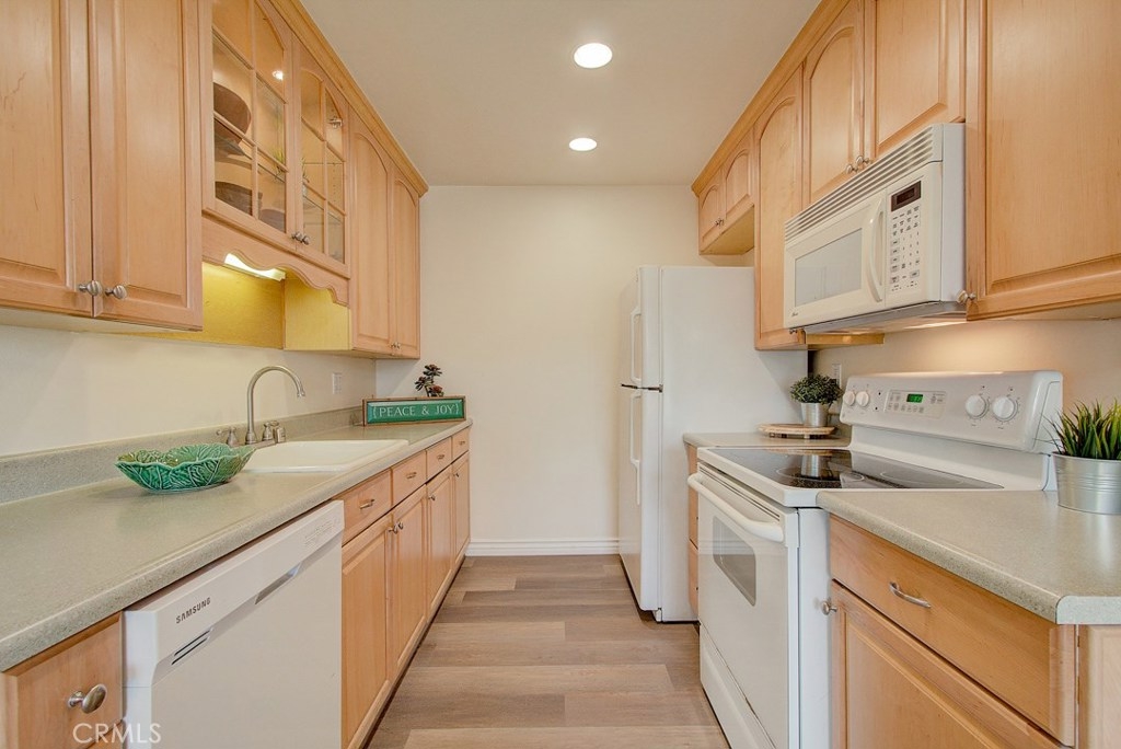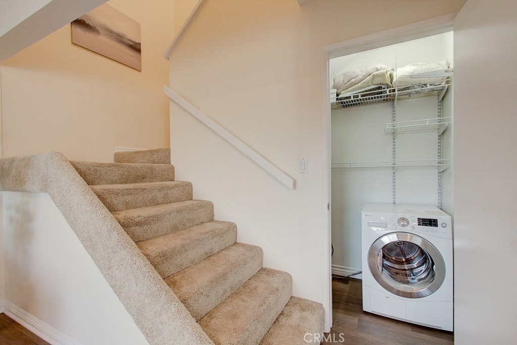 Miraleste Canyon Estates Condo with Views. Just a short distance from the parking structure along a tree shaded path, this condo is bright and has an unobstructed canyon view. The downstairs living area features new, trendy laminate flooring, an open kitchen and a coat closet with laundry hookups. Upstairs the master has en-suite bathroom and plenty of storage. The bedrooms face the canyon providing a quiet and private escape. The community is gated for extra security and features resort-like amenities including 3 pools, 2 hot tubs, 2 fitness centers, library, and pool and ping pong tables in the clubhouse. There is a shared laundry unit close to the unit that is convenient for washing larger loads.
