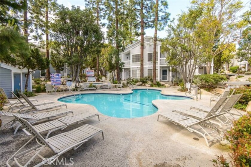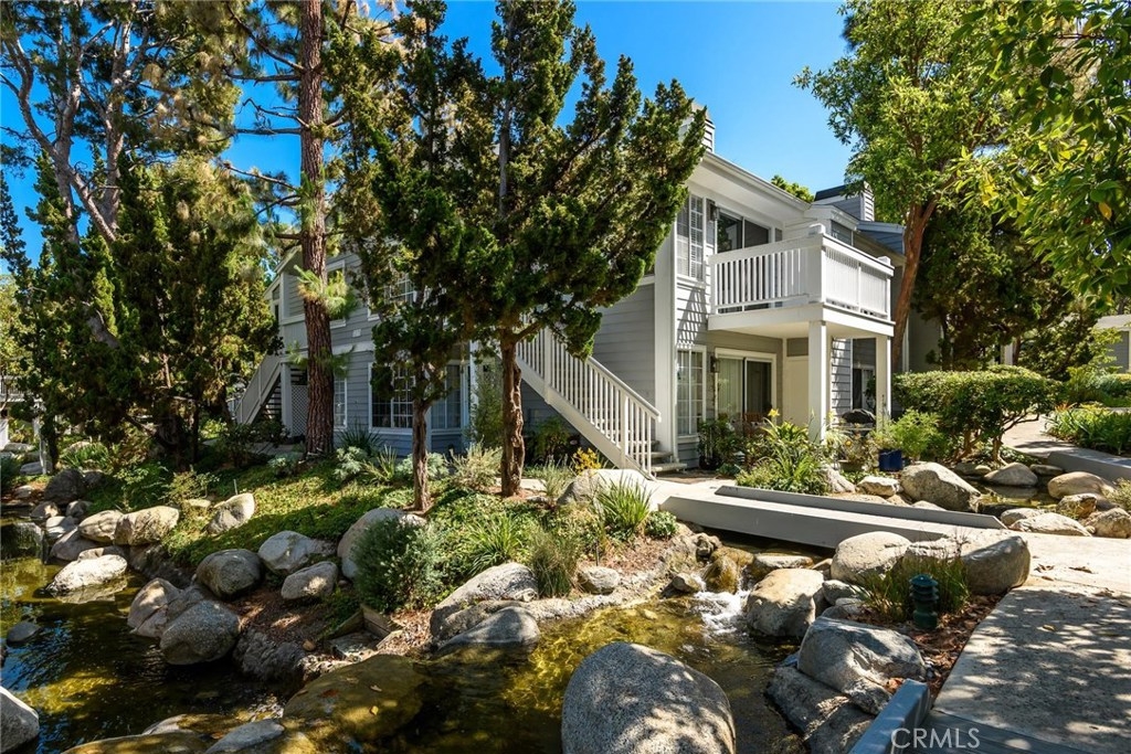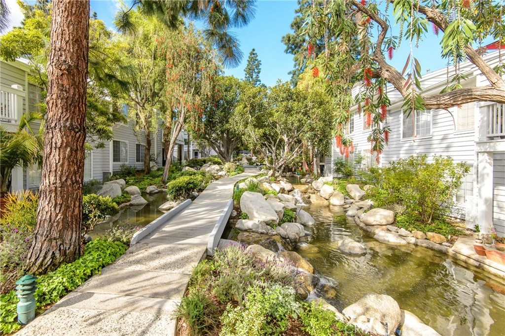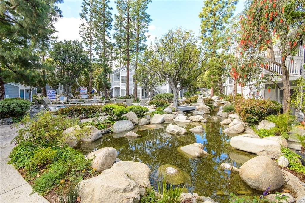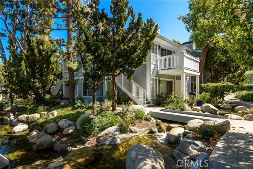 Enjoy this Very clean upper unit overlooking the stream and pool area. Let the soothing sound of the running streams lull you to sleep at night. The dining area is Light and airy and the living room has a cozy fireplace and a sliding door leading to the spacious balcony. Bamboo floors throughout most of the home. The kitchen has been updated with quartz counter tops and tile floors. This unit has 2 full baths and an inside laundry room. The master bedroom has a walk-in closet and New carpet in both bedrooms. Central air, new water heater, 2 parking spaces and a storage locker on the balcony. Washer and Dryer included. This is the ONE!