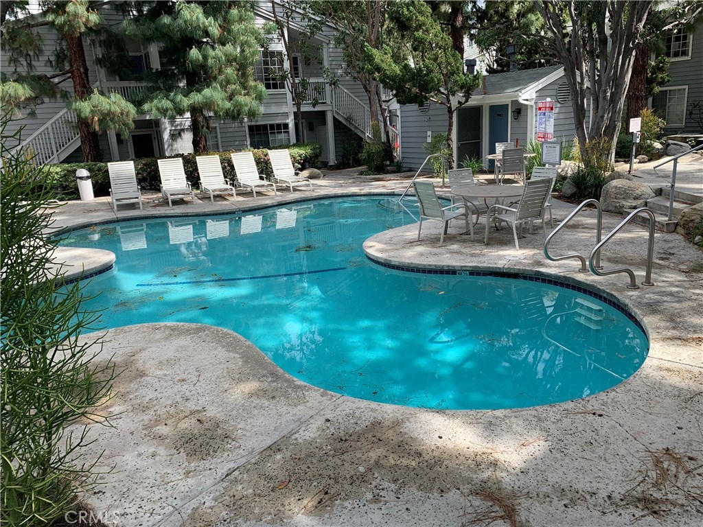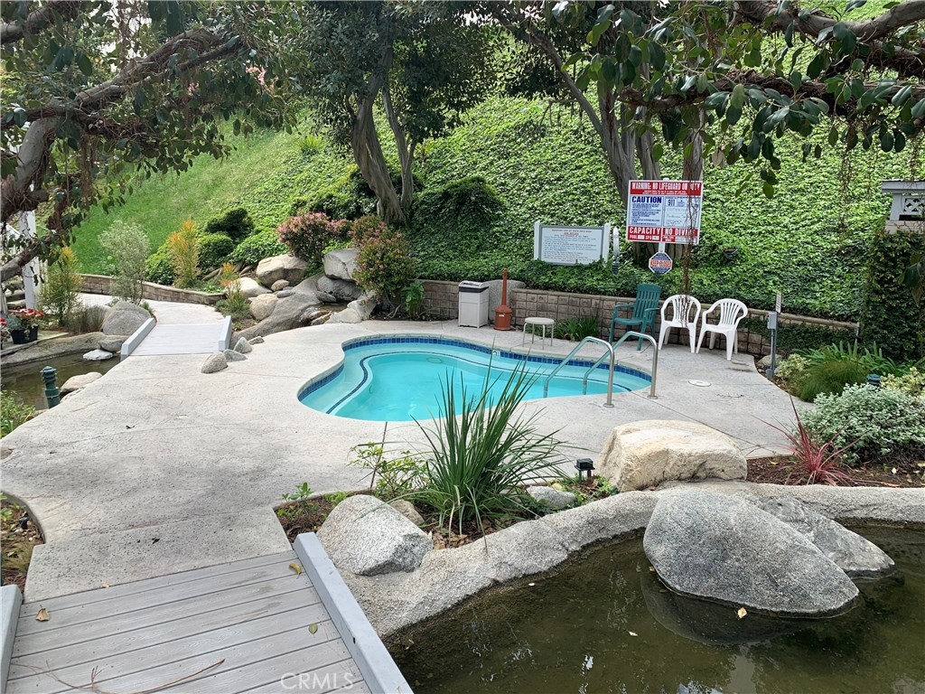 Extremely rare 2 Bedroom upstairs corner condo in Ponderosa Springs. You will love the ambiance and the serenity of this mountain resort styled development with its running streams, beautiful gardens, gorgeous pine trees, waterfalls and sparkling pools and jacuzzis. This corner lot has a unique outdoor balcony with incredible views of the water features and nature surrounding it. The condo has been well maintained with granite upgrades, fireplace, new carpet, and AC. The master bedroom is spacious and the attached bath is move in ready condition. A designated laundry room is inside the home for ultimate convenience. The two parking spaces are super close to the unit making a grocery run a breeze. Ponderosa Springs finished a $4.5 million exterior renovation and the seller is paying special assessment in full at close of escrow! Conveniently located to Terraces Shopping Center, grocery stores, shopping, several restaurants, schools, and parks! Hurry, this one will go quickly!