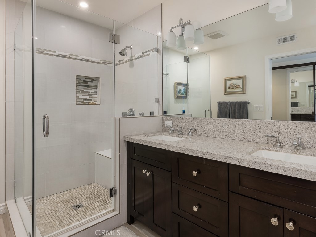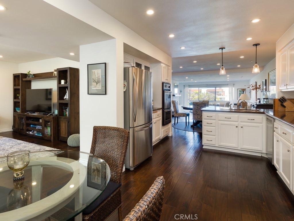Fully remodeled, gorgeous spacious open concept unit overlooking the Ocean, Coastline and Catalina Island view in immaculate “Turnkey” condition. This beautiful South Shores Racquet Club lower level unit has 2 Bedrooms, a large Den (can convert to 3rd Bedroom), 2 full baths and one ½ bath. Open floor plan offers an abundance of natural light. Gorgeous remodeled gourmet kitchen with white cabinetry, Silestone counters, custom tile backsplash, high-end Stainless-Steel appliances. Elegant dark rich Walnut hardwood floors and custom recessed lighting throughout. Luxurious Master Bedroom suite with an expansive bathroom with custom seamless glass shower enclosure and custom bathtub. All three bathrooms upgraded with modern fixtures, toilets, counters, sinks and ceramic tile flooring. Living room with a glass/gas fireplace with travertine cut marble and Master bedroom suite have direct access to balcony overlooking panoramic ocean view. Dining areas include an open formal dining room adjacent to the step-down living room, breakfast nook in kitchen, and a bar area. Nice flow throughout that leads to a private patio/balcony to enjoy breathtaking sunset and ocean views every night. Ideal for entertaining or relaxing in a peaceful, serene setting. Includes two garages with attached large separate workroom. Enjoy a short walk to the RPV border, Trump Golf Course, Ocean Trails. Property is absolutely Move-in ready at an outstanding value. This one won’t last!