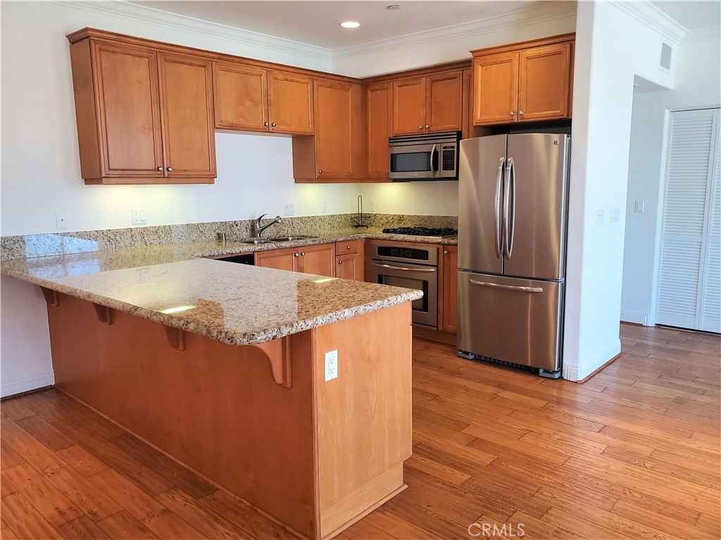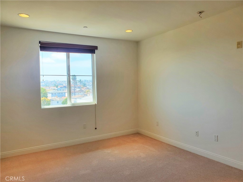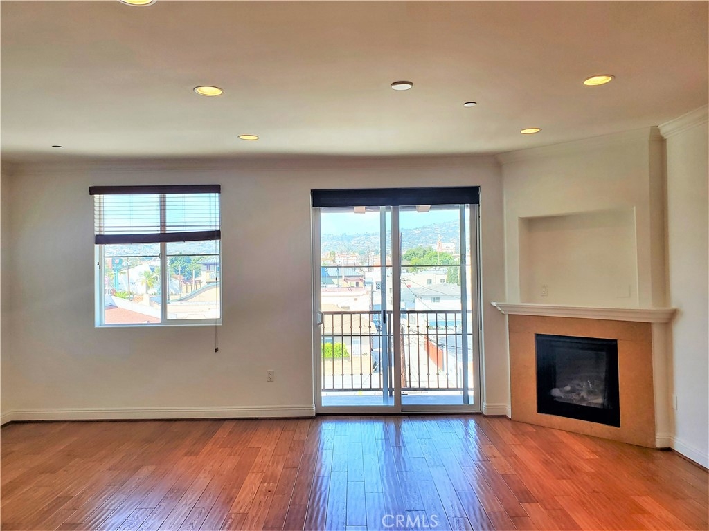 This elegant 3rd floor Grand View, corner residence offers recessed lighting, living-room gas fireplace with mantel, 5" crown molding and baseboards, generous height ceilings, quality hardwood flooring, sleek granite slab counters, European style maple cabinets, stainless steel kitchen appliances, stacked washer and dryer in laundry closet, new carpet in the master-suite and second bedrooms, spacious balcony, roof top deck with 360-degree views of San Pedro Harbor, Ports O’Call Village, 22nd Street Landing, Vincent Thomas Bridge, and Palos Verdes, and 2 car tandem parking in the garage.