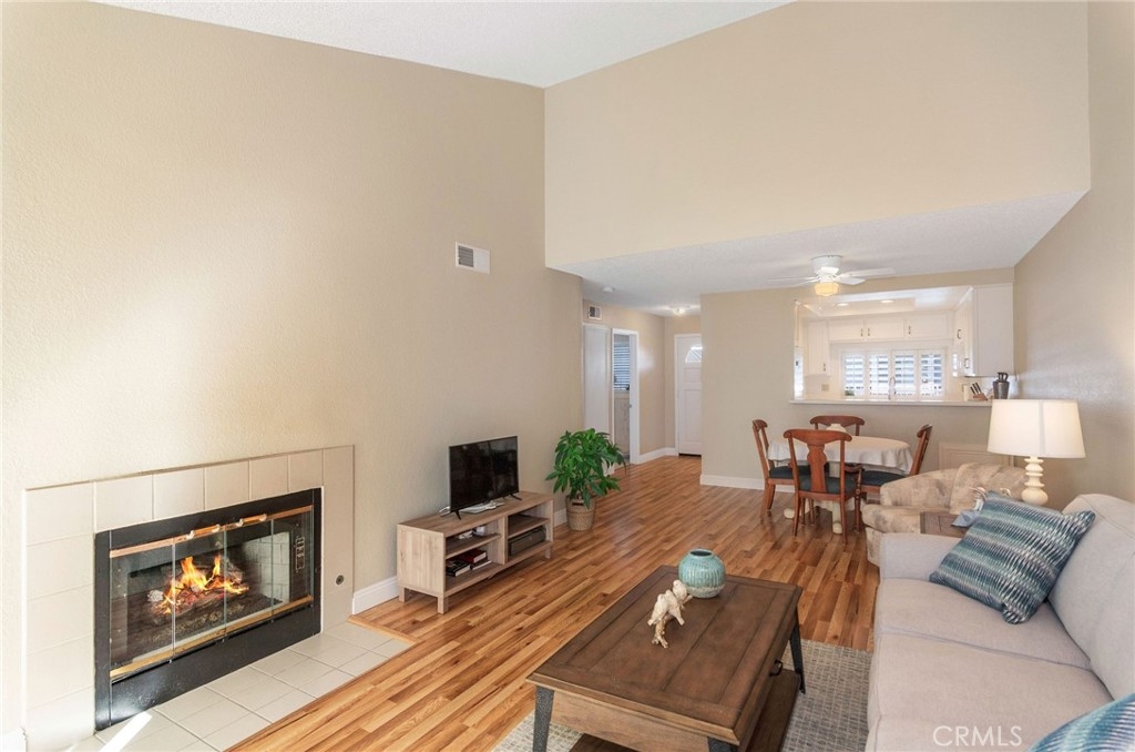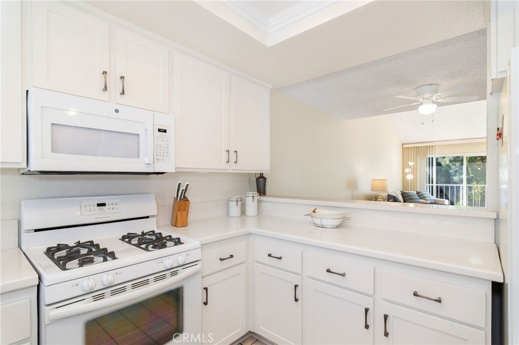Rarely available-top floor unit! This 2 bedroom west facing condo has everything you need. When you enter, there is a bright white kitchen to the left that opens up to the dining and living room area. Vaulted ceilings expand the space to let the sun shine in. The view is what captivates you. Enjoy privacy with serene tree views and soothing sounds of the waterfall below you on your roomy balcony. Notice the newer wood laminate floors and carpet through out the unit. The spacious primary bed room has vaulted ceilings and 2 large closets. Extra storage through out the unit including a personal locked storage room right outside your unit. Gated entry with gated subterranean garage and 2 parking spaces near ELEVATOR. Well maintained landscaping through out the complex. Relax by the pool and jacuzzi. In 2021, the following improvements were made: NEW heating and air conditioner system, wood laminate flooring, carpets, ceiling fan, and interior paint. In the kitchen: refaced cabinets with new doors, drawers, and hardware. Replaced dishwasher, microwave, and disposal. Additional HOA amenities include: water, trash, sewer, land maintenance, insurance, and earthquake insurance. Close to restaurants, shops, and freeways.