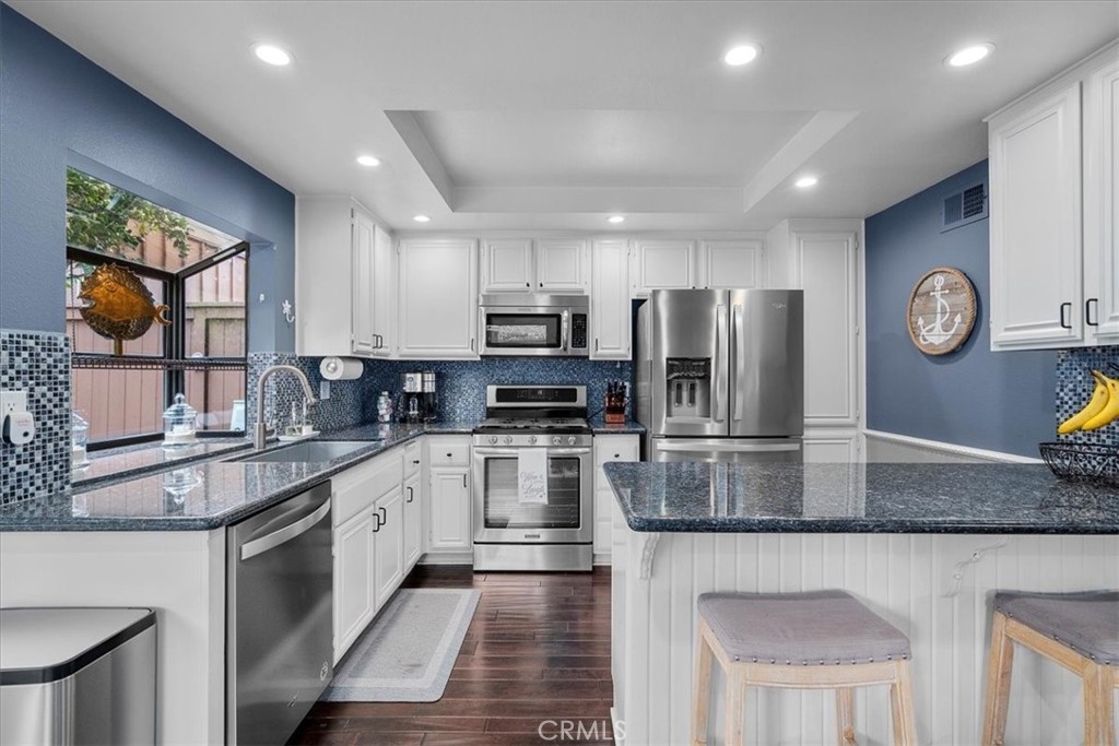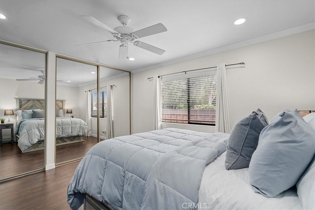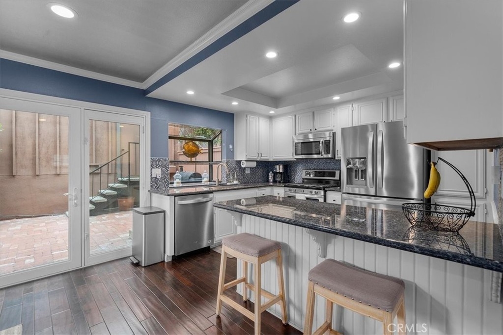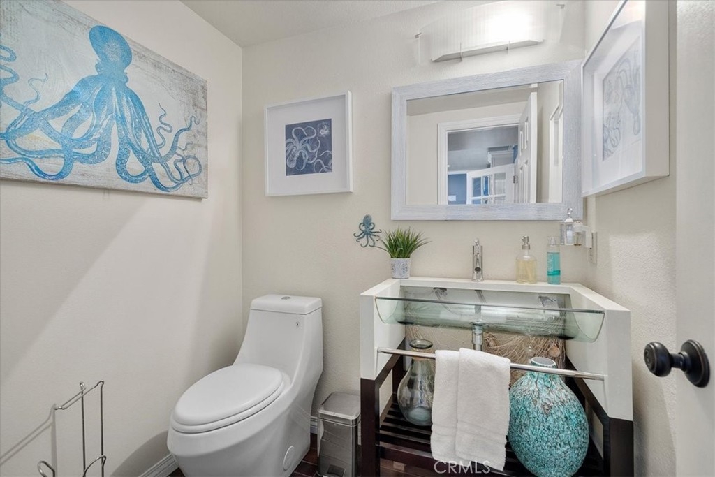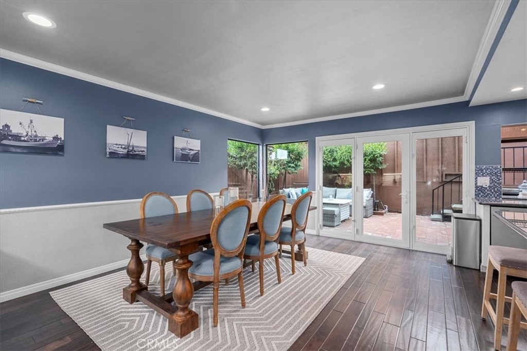 MOTIVATED SELLER!! REDUCED PRICE! Welcome home to this beautifully remodeled end-unit within the coveted enclave of “The Gardens!” This home welcomes you into the spacious living room with hardwood floors, recessed lighting, and dual panel windows that run throughout the home, along with plantain shutters and a slick staircase railing that provides a modern and custom design. The living room leads you into the bright and open dining room that has been remodeled with a stunning wine bar designed with beautiful white cabinetry, quartz counters, stone backsplash, and a wine fridge - perfect for entertaining and hosting. Providing an open concept feel, the dining room flows seamlessly into the kitchen fit with a long counter that has barstool seating, white cabinets and blue accents to flow with the dining room, and newer stainless steal appliances. The wall of windows and glass door provide an indoor/outdoor feel and leads you out to the back patio. The patio offers more length than most units, allowing plenty of room for extra seating, a BBQ area, and even planting your own garden. The hanging lights bring a nice ambiance whether you are hosting or just enjoying some peace and privacy under the night sky. Upstairs there are two primary suites each with their own remodeled bathroom, recessed lighting, laminate floors that match the hardwood floors, dual panel windows, and one room that has its own balcony with a sliding glass door. As an end unit with only one shared wall, this home comes with rare extra large closets in both bedrooms (finished with drywall and flooring) ideal for extra storage, a playroom for kids, more clothes, or whatever fits your needs! This home sits on the corner of Mount Shasta and Westmont, providing plenty of available street parking - great for someone with multiple cars, big cars that don’t fit in the garage, entertaining guests, and/or those who want to use the garage as a work shop or man/ma’am cave. Additional bonuses include an entry level half bathroom, pantry, central AC, and a private 2-car garage with a laundry area and storage. The Gardens is San Pedro’s most sought after community known for its lush greenbelts, functional homes, tennis courts, and pools. Centrally located, this home is near schools, parks, restaurants, and shopping; convenient for commuters whether you’re heading to the freeway or the beach cities. Whether you like to entertain or prefer peace and privacy, this home fits any persons needs. Welcome home!