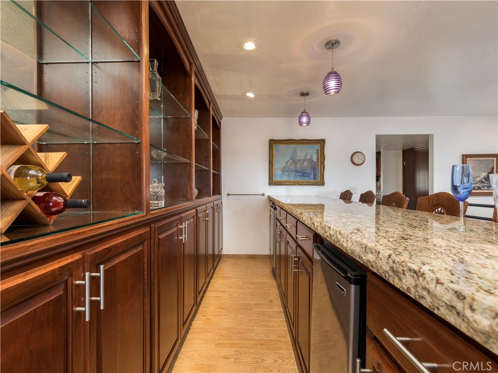 A beautifully remodeled(2016) 1736 sq ft (BTV) gated townhome is on market. THIS IS A LONG TERM LAND-LEASE COMPLEX...31 years left on lease: $1130.00 a month and due to IRS TAX CODE 1055, "Redeemable ground rent" the cost is TAX DEDUCTIBLE. Check with your CPA. $429 HOA fee. There are two good-sized bedrooms, two full baths with spa tubs and a half bath. The home has solid elegant cherry wood cabinets, drawers, closets, high end granite countertops in bathrooms, kitchen and a custom bar with two refrigerators. The unit has a lovely fireplace, double glazed windows, recessed lighting, huge safe, an air-conditioning unit in living room and tiled balconies off living room and one master bedroom. There is a small view of ocean. There are two side by side parking spots and your own walk-in storage room in a secured gated subterranean garage. Pool,spa, workout room plus, right next to Cabrillo Beach Marina and the 22nd Street Landing restaurant. The Tommy Bahama furniture and flat screen televisions are negotiable. Stainless washer, dryer, refrigerator are included.