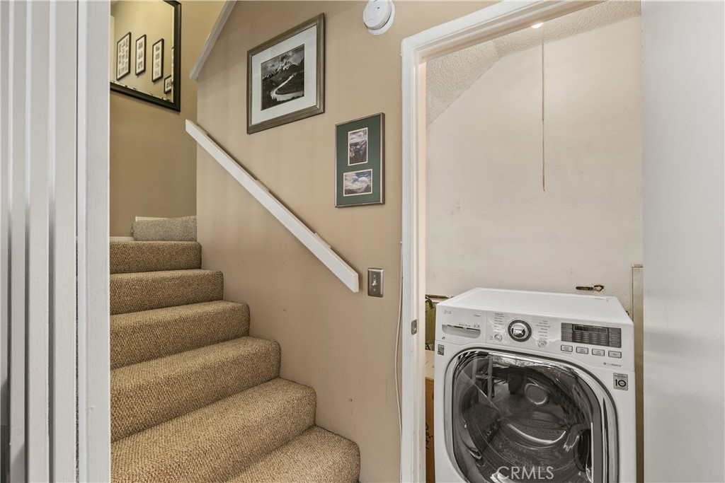 Pre-Approved buyer failed to qualify for their loan so back on the market after being in escrow for 3 weeks. .This two bedroom one and a half bath unit is well located off the main street. The downstairs features the kitchen, dining area and living room open floor plan as well as a half bath and laundry with combo washer/dryer on this level. Upstairs, you will find two generously sized bedrooms with an accessible bath. The complex offers three pools and two spas. The clubhouse areas include game, community and exercise rooms. Enjoy peace of mind with 24/7 security with controlled access; one assigned parking spot. Explore nearby restaurants shopping and parks. Close proximity to local freeway access. Supplement contains complex map.