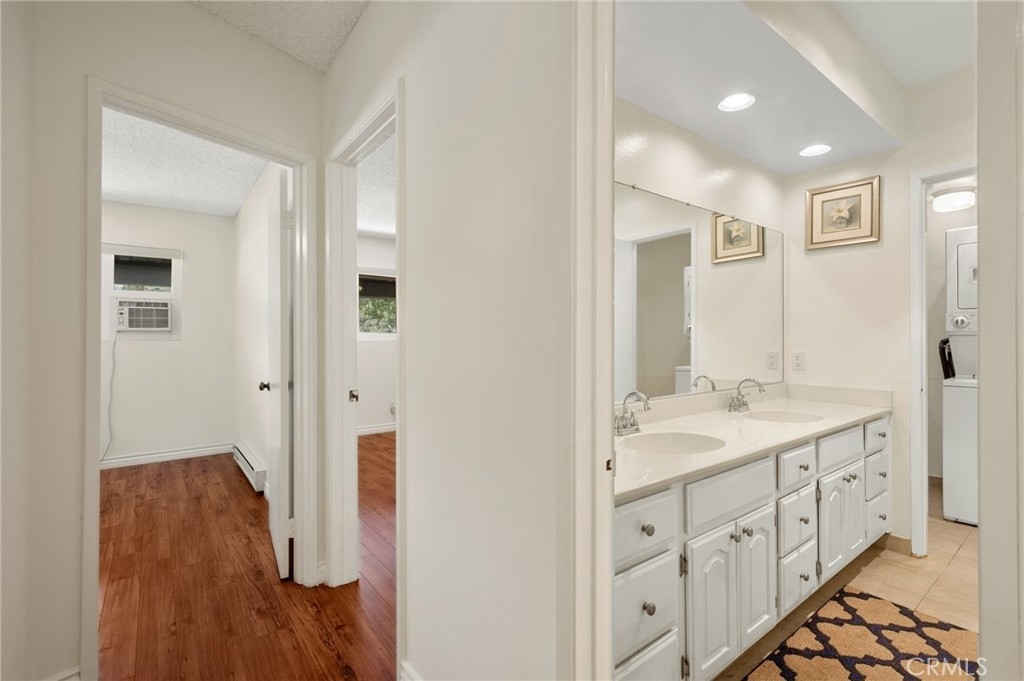 One of the best locations at this complex, this 2 bedroom 2 bath condo is ready and awaits your personal touch to make it your new home. With close proximity to designated parking as well as being just steps away from an entry gate off upper 1st St., this allows for easy access and additional street parking just steps away from this ideally located unit. The downstairs features a large living room and half bathroom that nicely flows into the dining room and kitchen. This unit attracts plenty of natural lighting and includes a newer sliding glass door that leads to the outdoor patio area. The galley style kitchen features tile countertops and plenty of cupboard space for all of your culinary needs. Step upstairs and find two bedrooms both with ample closet space and updated vinyl windows (with A/C window Units). A full bath with access from the primary bedroom as well as hall features a shower and tub, dual vanity sinks off the shower, plus a stack washer and dryer. The complex features many amenities, including 3 pools, 2 hot tubs, gym, ping pong and billiard tables, library, common area with fireplace and TV, club house with full kitchen and gorgeous views, on site management and 24 hour security.